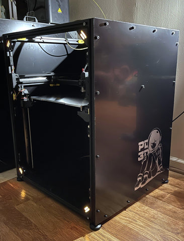 A: Kraken Motors 55 Volt, GT3 belts, Chube, Nanoflow Nozzle, LGX Lite Pro, 25T pulleys on the Y-axis, Luke's Lab Camera, 24 Volt Cobb LED Lights, PCCF printer printed parts, 10mm thick insulation, Youmetong Preloaded linear rails (soon), and custom side panels from Mandela RoseWorks.