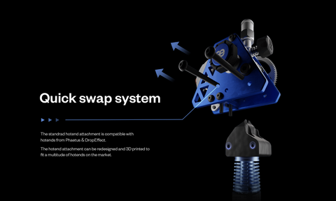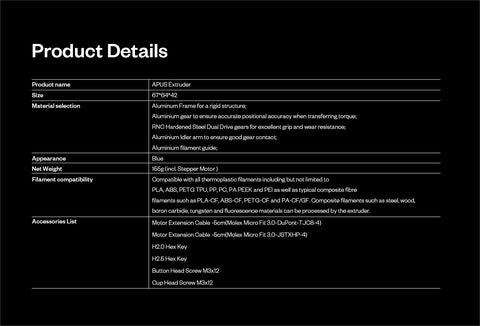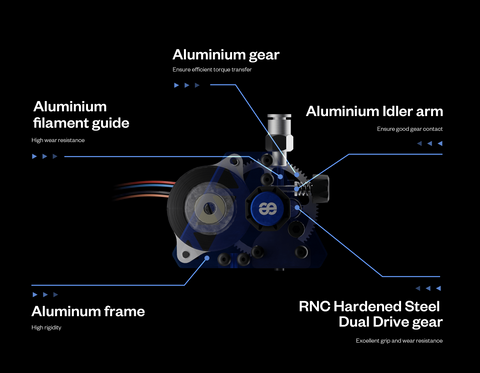 Phaetus' Apus Extruder is an all-metal construction weighing 155g, equipped with a small, efficient Nema stepper motor for high print speeds. Optimised RNC dual drive gears with a transmission ratio of 6.3:1, the APUS extruder ensures high torque. The special gear design of the optimised Dual Drive Gear system features the same number of hardened RNC steel teeth that have a polished surface.