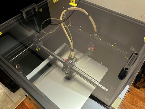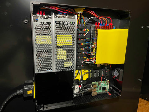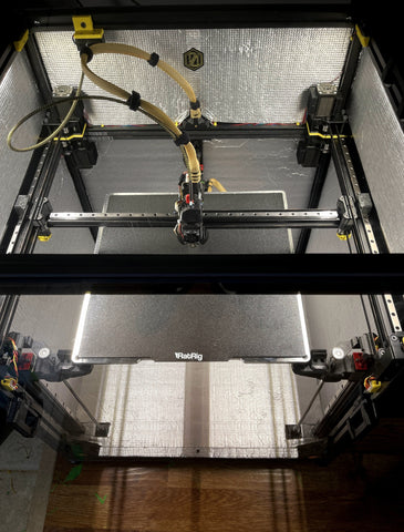 A: Kraken Motors 55 Volt, GT3 belts, Chube, Nanoflow Nozzle, LGX Lite Pro, 25T pulleys on the Y-axis, Luke's Lab Camera, 24 Volt Cobb LED Lights, PCCF printer printed parts, 10mm thick insulation, Youmetong Preloaded linear rails (soon), and custom side panels from Mandela RoseWorks.
